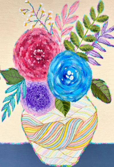 """이 작품은 “연결과 생명”을 주제로 하고 있다. 서로 다른 색의 실들이 엮여 하나의 덩어리를 이루는 모습은, 인간과 자연, 혹은 서로 다른 존재들이 관계 속에서 조화롭게 얽혀 있는 모습을 상징한다. 겉으로는 복잡하고 뒤얽힌 듯 보이지만, 그 안에는 유연한 흐름과 따뜻한 생명의 숨결이 존재한다. 그 위에 피어난 꽃들은 이러한 연결 속에서 피어나는 생명의 기쁨과 희망을 나타낸다. 색채는 다양하지만 서로를 해치지 않고 공존하며, 서로의 빛을 더해주듯 화합한다. 이는 작가가 추구하는 '아름다운 얽힘; '다름 속의 조화'를 시각적으로 표현한 것이다. 정교하게 얽힌 선과 매듭의 섬세한 색채의 조율은 민화의 서정성 과 현대적 조형미가 공존하는 지점을 드러내며, 과거의 정서와 현재의 감각이 자연스럽게 이어지는 시각적 언어로 완성된다"""