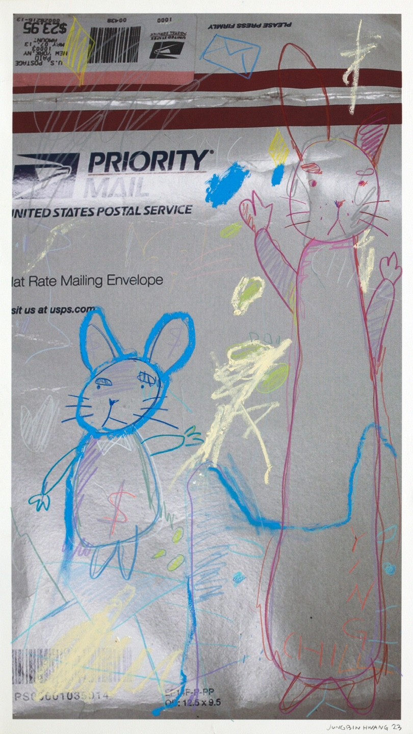이 작품은 지금은 점점 사라져가는 ‘편지’라는 아날로그적 행위를 주제로 합니다. 작가는 실제 사용된 우편봉투 위에 어린아이의 낙서같은 드로잉으로 친칠라를 그려 넣었습니다. 이를 통해 디지털 시대 속에서도 여전히 그리워지는 손편지의 따뜻한 감정과, 무심한 듯 솔직한 드로잉이 지닌 진정성을 함께 표현합니다.