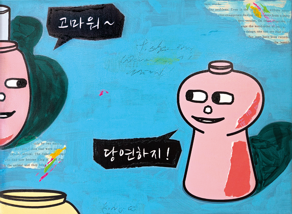 푸른 색면 위에 겹쳐진 텍스트의 편린과 계동의 오래된 도자기는 근대적 기록의 언어와 생활사적 기억을 대비하며 조용한 대화를 나눈다. 계동은 과거·현재·미래가 중첩되는 시간의 교차점으로, 사물 간의 교감과 원초적 소통을 은유한다.이 작품은 기술과 전통, 세계어와 장소 언어의 긴장을 공감의 장으로 전환하며 동시대적 감수성을 담아낸다.