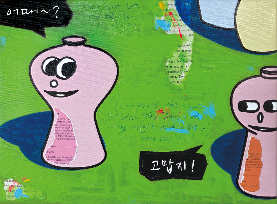 선명한 녹색 화면 속 도자기 형상들은 서로를 바라보며 질문하고, 망설임 없이 응답한다.찢긴 텍스트의 파편은 기억과 언어의 흔적으로 남아, 대화 사이사이에 스며든다. 이 작품은 사물의 대화를 통해 시간과 감정이 오가는 관계의 풍경을 유쾌하게 그려낸다.