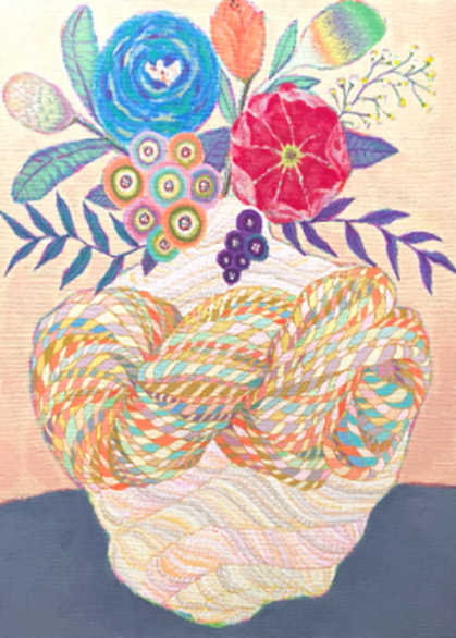 """이 작품은 “연결과 생명”을 주제로 하고 있다. 서로 다른 색의 실들이 엮여 하나의 덩어리를 이루는 모습은, 인간과 자연, 혹은 서로 다른 존재들이 관계 속에서 조화롭게 얽혀 있는 모습을 상징한다. 겉으로는 복잡하고 뒤얽힌 듯 보이지만, 그 안에는 유연한 흐름과 따뜻한 생명의 숨결이 존재한다. 그 위에 피어난 꽃들은 이러한 연결 속에서 피어나는 생명의 기쁨과 희망을 나타낸다. 색채는 다양하지만 서로를 해치지 않고 공존하며, 서로의 빛을 더해주듯 화합한다. 이는 작가가 추구하는 '아름다운 얽힘; '다름 속의 조화'를 시각적으로 표현한 것이다. 정교하게 얽힌 선과 매듭의 섬세한 색채의 조율은 민화의 서정성 과 현대적 조형미가 공존하는 지점을 드러내며, 과거의 정서와 현재의 감각이 자연스럽게 이어지는 시각적 언어로 완성된다"""