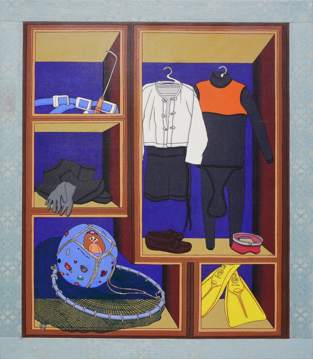 "우리의 전통 민화 중, 책을 비롯한 책가의 다양한 도구 등이 놓여진 그림을 그린 책가도를 모티브로 삼았습니다. 책가 안에 바당에 들어갈 때 반드시 필요한 해녀의 물품들을 그렸습니다. 현대적인 고무옷이 나오기 이전의 '소중이'를 비롯해 지금도 필수적으로 챙겨야 하는 물질 도구들을 배치했습니다. "