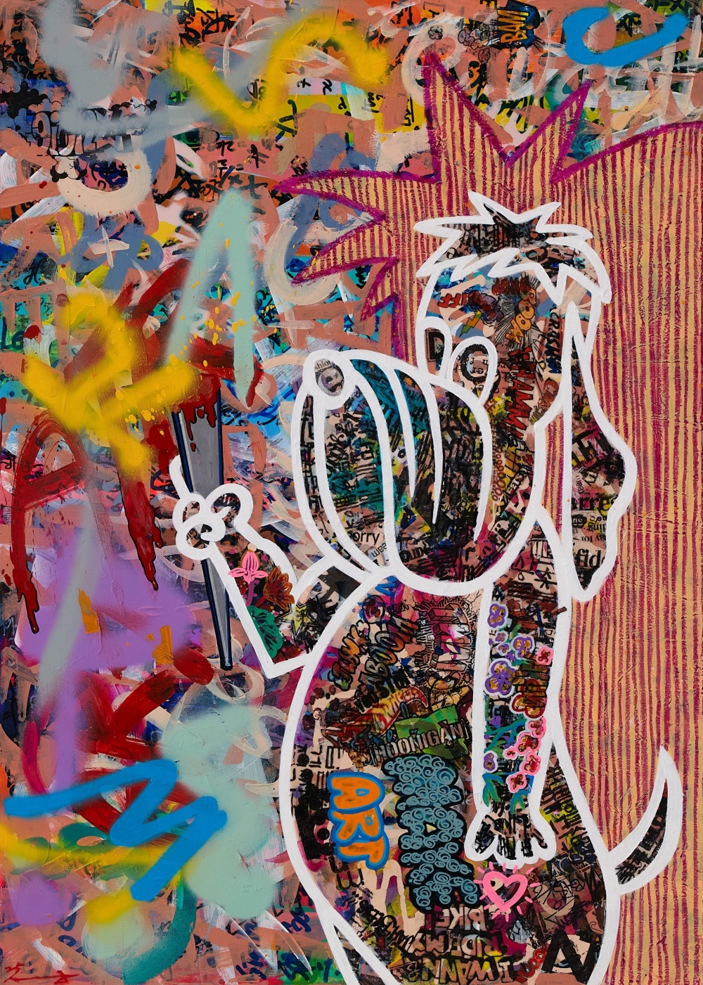 "반려동물을 통해 인간의 언어와 감정이 스며든 존재의 내면을 시각화한 작업이다. 동 물의 형상 위에 겹쳐진 텍스트와 색채는 본능과 문화가 충돌하며 재편되는 과정을 드러낸다. 화면 속 캐릭터는 인간 사회의 규범을 학습한 존재로 변형된 상징이다. 작가는 감각적 색 면과 기호의 분절을 통해 동물성의 흔들림과 인간화된 욕망을 동시에 표현한다. 이는 본능과 언어 사이에서 생 성되는 새로운 정체성의 풍경을 탐구하는 시도이다."