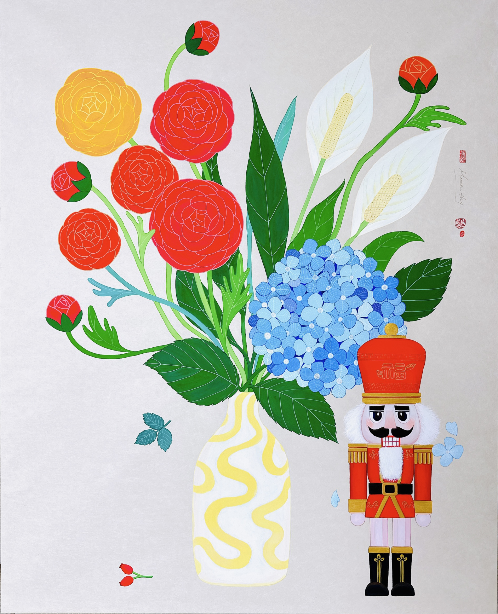 "< 맞이함, 봄: 전통 화병도와 호두까기 병정의 이색적인 조우> 전통 민화의 ‘기명절지화(화병도)’ 형식에 서구적 오브제인 호두까기 인형을 배치하여, 동서양의 미감이 교차하는 위트 있는 변주를 선보입니다. 한지 위에 겹겹이 쌓인 팝아트적 색채는 만개한 꽃들이 상징하는 삶의 절정, 그 찬란한 환희를 시각화합니다. 화병 곁을 든든히 지키는 병정은 우리 곁에 찾아온 복(福)이 흩어지지 않게 지켜주는 수호자입니다. 이 이색적인 만남이 전하는 싱그러운 예감이 머무는 공간을 매일 봄날처럼 환하게 밝히는 따뜻한 축원의 통로가 되기를 소망합니다."