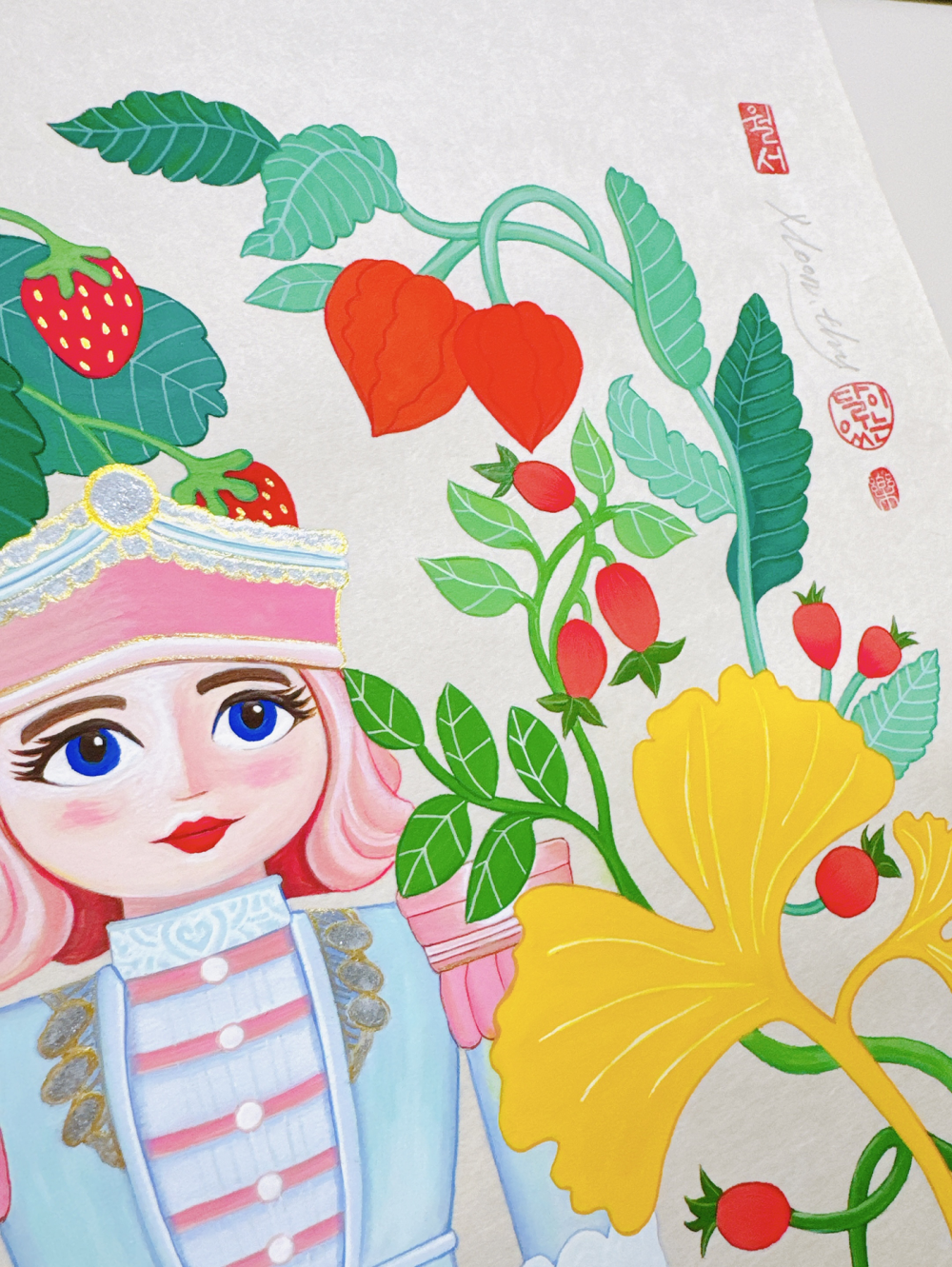 "<봄의 전령: 긴 잠에서 깨어난 생명의 축제> 본 작품은 전통 민화의 길상적 의미를 현대적 미감으로 재해석한 모던 민화입니다. 화면 중앙의 봄의 전령은 단순한 계절의 인도자를 넘어, 우리 삶의 새로운 여정을 곁에서 지켜주는 든든한 수호자를 상징합니다. 전령의 발끝에서 피어난 풍성한 식물들은 곧 우리에게 찾아올 충만한 생명력과 행운의 결실입니다. 생동감 넘치는 색채로 그려낸 이 에너지들이 낯선 시작 앞에 선 이들에게 따뜻한 위로와 용기를 전하며, 앞날을 환히 밝혀주는 긍정의 기운이 되기를 소망합니다."
