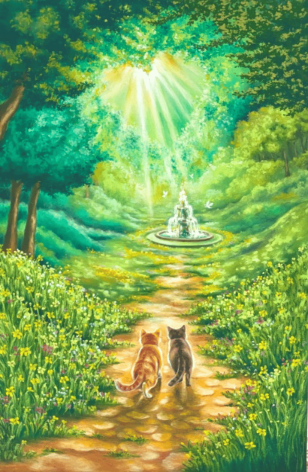 숲 사이로 쏟아지는 빛을 따라 두 마리의 고양이가 천천히 길을 걷는다. 앞에 보이는 작은 분수와 날아오르는 나비들은 이 길의 끝에 기다리는 평온한 순간을 암시한다. 이 작품은 목적지보다 누군가와 함께 걷는 시간의 따뜻함을 이야기한다. 빛으로 가득한 숲 속에서 서로의 곁을 지키며 나아가는 조용한 동행의 순간을 담았다.